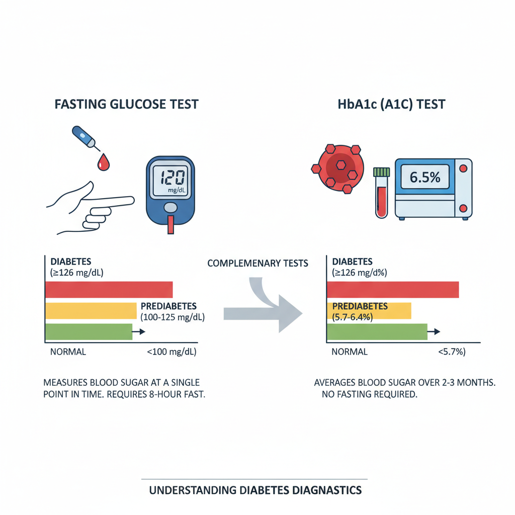 Fasting glucose and A1C tests offer different insights into blood sugar levels. Fasting glucose provides a snapshot of your blood sugar at a specific moment, reflecting how well your body manages glucose overnight. In contrast, A1C provides an average of your blood sugar levels over the past few months, showing how well your diabetes is being managed overall. Fasting glucose is primarily used for daily monitoring and immediate adjustments to diet or medication, while A1C is used for diagnosing diabetes and assessing long-term control. Understanding these differences is crucial for effective diabetes management.
